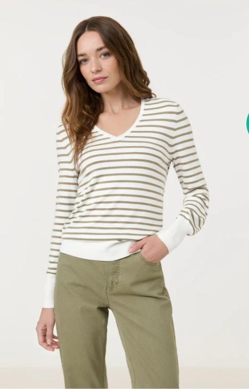 Женский полосатый свитер Taifun с длинными рукавами и V-образным вырезом. Выполнен из тонкого трикотажа в белом цвете с тонкими оливковыми горизонтальными полосками. Имеет широкие белые манжеты и нижнюю кайму. Идеален для стильного повседневного или офисного образа. Замеры: пог- 48 длина- 71 бирка со составом срезанная
