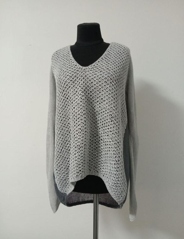 Стильный, эффектный пуловер из высококачественного льняного полотна комбинированных вяз. Манекен 34/36. Пог 50-60 Низ 60+ Пройма 26 Плечо+рукав 85 Длина спереди 65 Длина сзади по центру 76