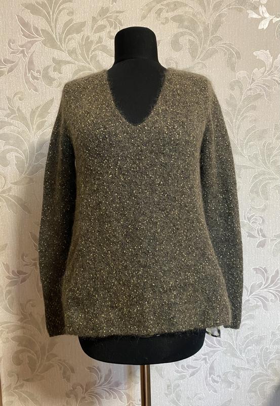Пуловер в ідеальному стані, знизу підшити шовкова майка, показала на фото. Сам пуловер кольору хакі з золотистим блиском. Склад на фото: верх - 46% поліамід; 24% мохер; 13% поліестер; 12% віскоза; 4% шерсть; 1% еластан. Нижня майка - 100% шовк. Довжина пуловера 59 см Довжина рукава 65 см ; є маленькі розрізи знизу Ширина плечей 40 см ПОГ під пахвами 47 см ПОТ 48 см ПО знизу 52 см; по боках розрізи 13 см . Повернення немає. Доставка за рахунок покупця