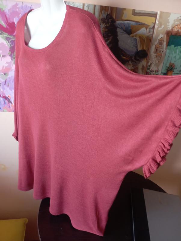 Длина 72 см, длина рукава от горловины 54 см, пог 92 см, пост 100 см. Цвет кирпический. Рукава - летающая мышь. Трикотаж тонкий, хорошо тянется, состав - вискоза и лен.