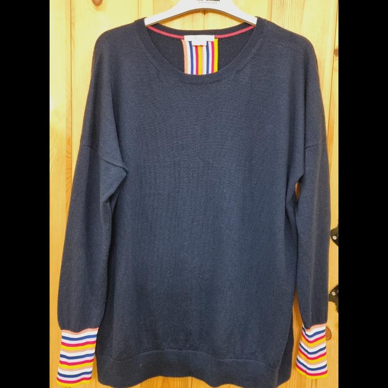 пуловер из тонкой, качественной шерсти.темно синего цвета с вставками из цветной вискозы.модель вытягивает фигуру.