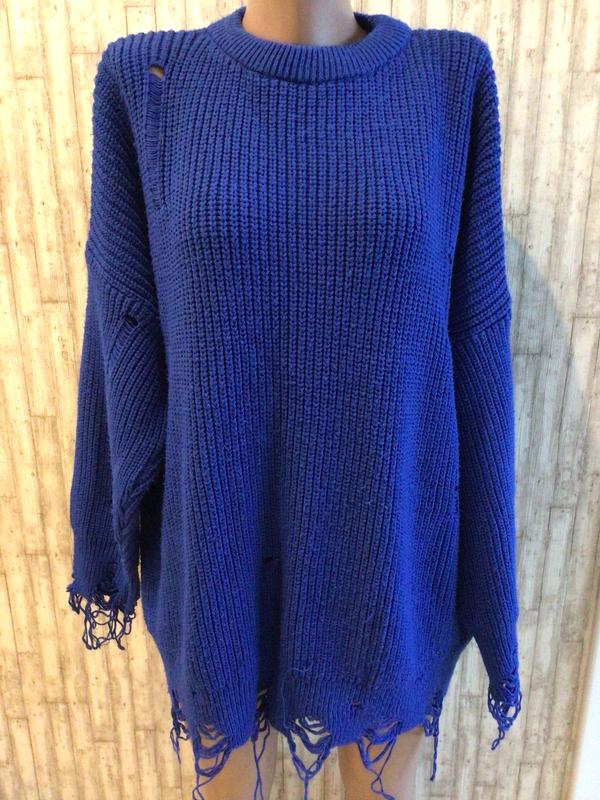 Цікавий пуловер в ажурних дірочках і бахромі по рукавам и низу 😁. УДДовжина70,пог 70, рукав від горловини 75. Оверсайз - від M до XL Насичений синій колір яскравий !