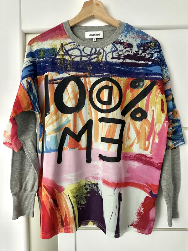 Яскравий та унікальний пуловер від бренду Desigual — поєднання насиченого арт-принту спереду та сірого трикотажного рукава й спинки. Унікальний ефект: ніби футболка, надягнена на лонгслів. • Розмір: S (унісекс фасон — підійде і на М) • Склад: 100% бавовна (верх принтованої частини), сірий трикотаж — м’який і еластичний • Стан: загалом дуже добрий, яскраві кольори без втрат. Сіра частина (рукави та спинка) має легкі сліди носіння. Без плям чи дефектів. Протестаний та випраний. Готовий до носіння. ⸻ 💸 Ціна: 520 грн (новий коштував понад 1500 грн; знижка через знос сірого трикотажу) ⸻ Відправка: поштомати/Нова пошта/Укрпошта Дивіться інші оголошення — багато стильного, брендового, арт і вінтажу.