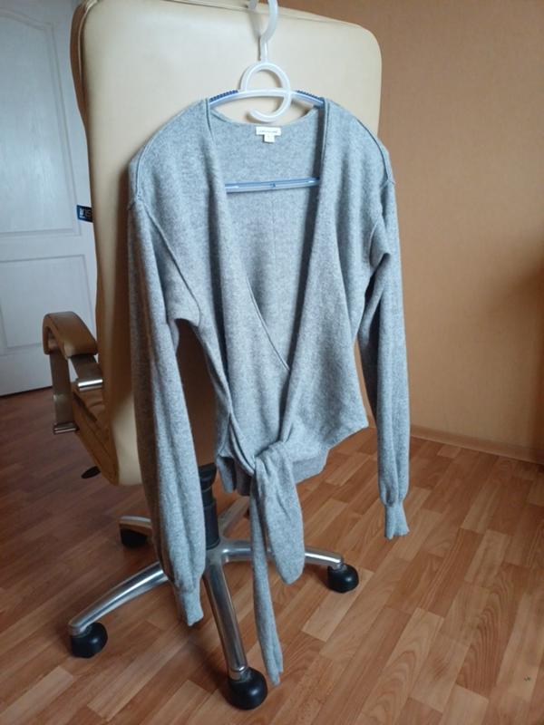 цвет красивый насыщенный серый именно такой серый в тренде трикотаж меланжевый сплетение нитей разных оттенков светло-серого и темно-серых цветов. состав 100% кашемир.кашемир мягкий легкий не тонкий очень теплый не колеблется антиаллергический.размер М. замеры pog 48 см.длина рукава от плечевого шва 64 см.длина рукава от ворота 84 см. длина 65 см. акцент ни наружные швы.современная модель широкие рукава собраны на манжет.Мажеты вязки мелкой рубчик. модель на запах. стильная современная модель завязки две кашемировые широкие энты. состояние идеально.