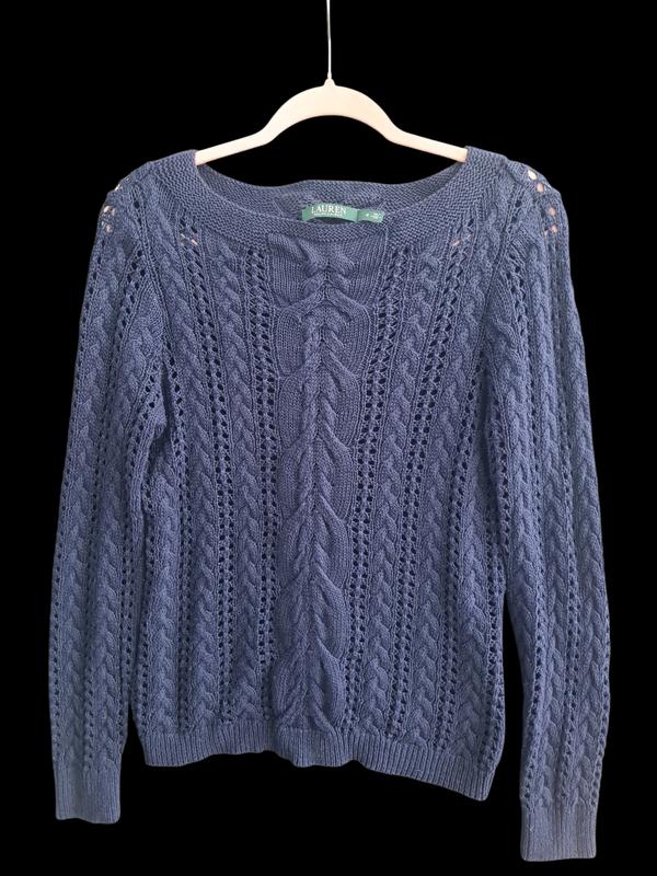 Мягкий синий джемпер Lauren. Состав- лен и хлопок. Цвет синий, не яркий, navy. Вязкая ажурная с косами. Рзмер М, замеры на фото. Вырез типа лодочка (ладочка), ширина плеча 9 см. По другим фо