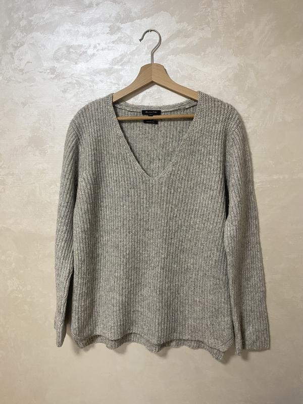 Жіночий полувер об’ємної вʼязки з вовни і поліаміду бренду Massimo Dutti. На розмір М сидите досить вільно. Пряжа з легким сріблястим відблиском. Довжина спереду 54 см, позаду -57 см; Довжина рукава 61 см; Напів об’єм грудей 52 см.