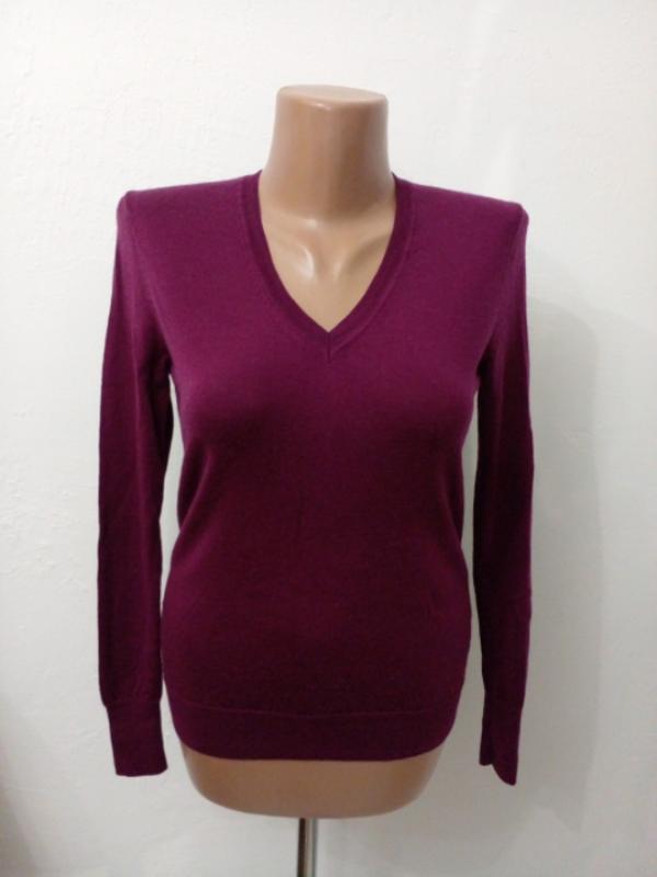 В идеальном состоянии, без следов ношения и нюансов, размер по бирке С. Бирку со складом срезано, но никаких сомнений что это шерсть нет, даже через фото видно. Цвет скорее фиолетовый чем бордовый. Трикотаж тонкий. плечі-38-40 пог-44-48 поб-44-48( тянется) рукав-61 длина-60