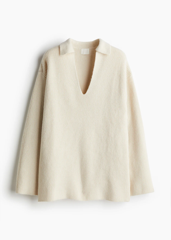 В наличии свитер свободного кроя фирмы HM в размере М или 46 Свитер свободного кроя в ребристую ткань. Воротник, V-образный вырез горловины и спущенные плечи. Артикул: 1242137003 Состав ткани 51% полиэстер 44% акрил, 5% шерсть. Замеры длина свитера по спине 71 см длина рукава от плеча 53,5 см длина рукава от воротника 74 см полуобхват груди 57 см