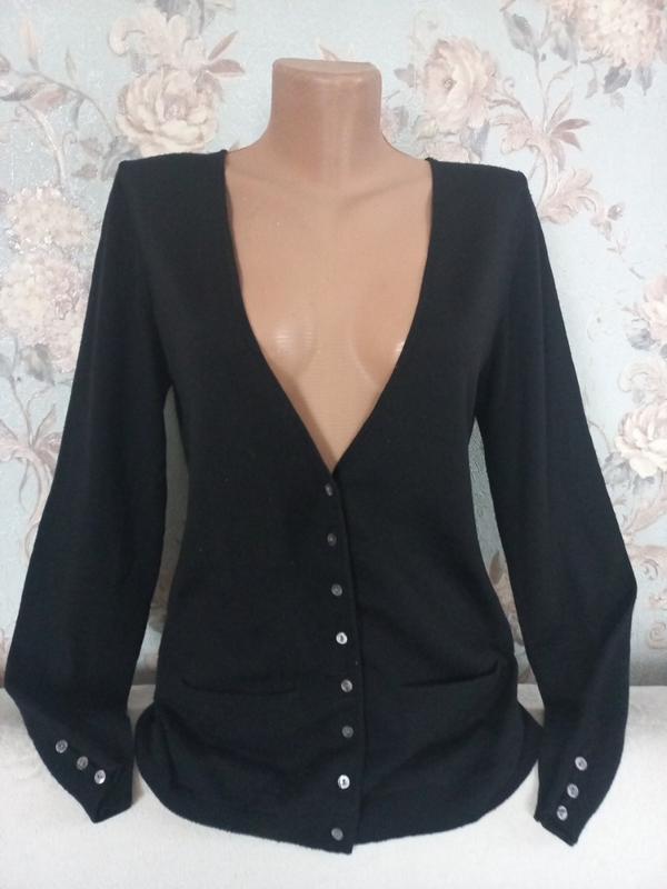 Легкая но теплая кофта из шерсти и кашемира. Имеет два кармашка, на рукавах пуговицы.До тела очень приятная. Единый нюанс на последнем фото (подобрено несколько петель по горловине позади плеча).Длина 64см, плечи 38, пог 48, рукав 64