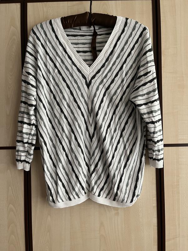 Пуловев с треугольным вырезом. Ткань - хлопок со льном. Длина 60, плечи 52 (спущены), от горловины до низа рукава 54, по груди 51, по низу 41, хорошо тянется. Рукав на 3/4. Состояние новой вещи
