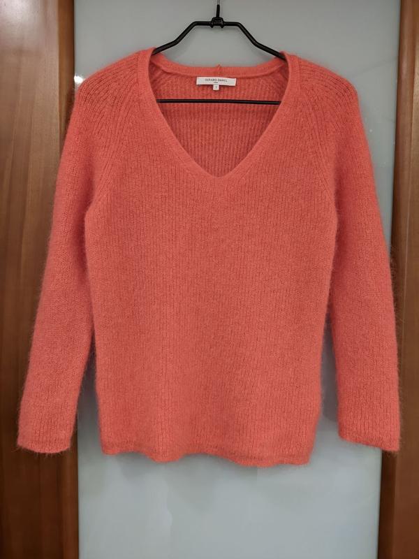 35 % мохер, 35% альпака, 30% полиамид, яркий пушистый пуловер, длина 62 см, ширина 46 см, рукав от шеи 70 см.