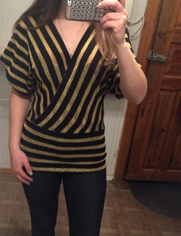 Кофта в черно-золотую полоску, с красивым декольте. Размер с-м.