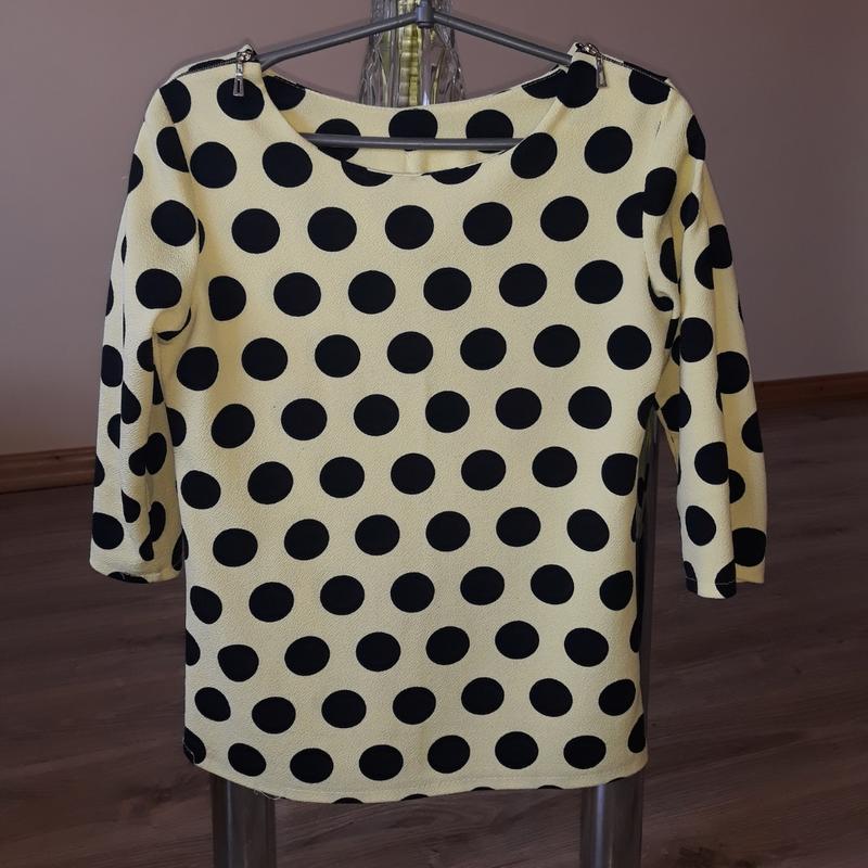 Стильна кофточка в горохи, яскраво жовтого кольору. Стан нової!!! Розмір S-M. ПОГ 43 см., довж. 61 см., плечі 39см., рукав 40 см.