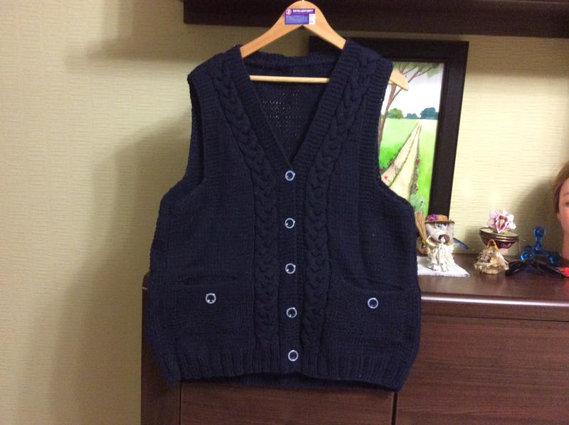 Безрукавка темно фиолетового цвета связана вручную из полушерстяных ниток. Длина 63, ширина плечей 42,объём груди 110,длина проймы 26.