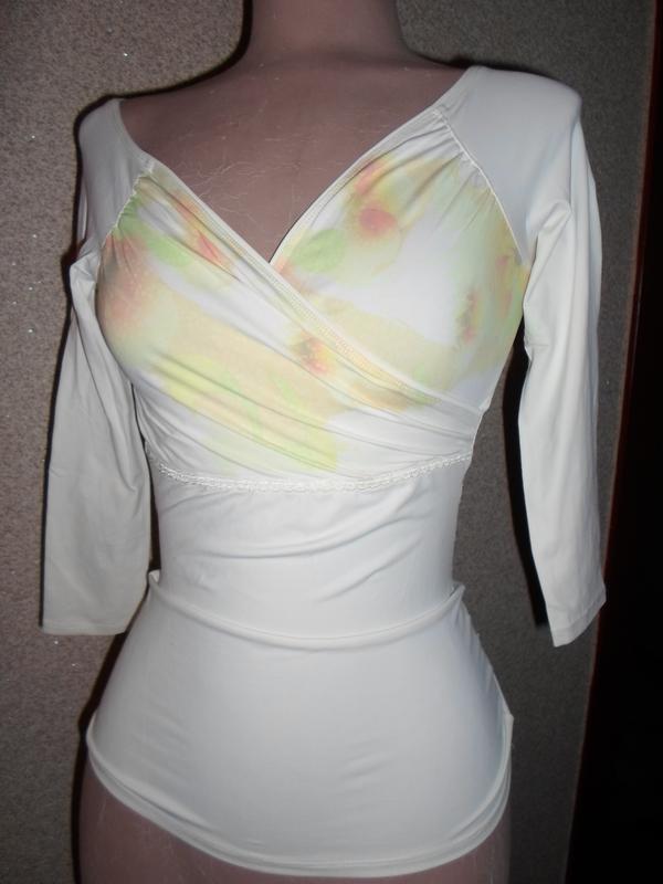 Интерсная облягає кофточка, ліф на запах Приємне якість, склад 100% поліамід, м'який, тонкий еластичний трикотаж Розмір вказаний S пог 36-46 см пот30-40 см побіди 36-46 см Довжина 50 см Рукав від ворота 43 см