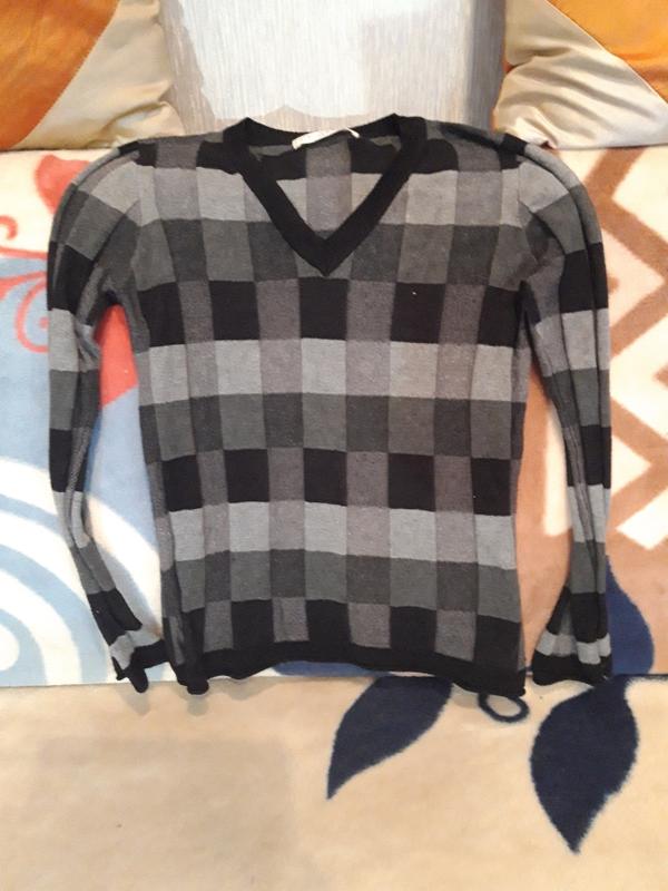 свитерок полосатый, вырез мысиком. состав полиэстера, спандекс. состояние хорошее. замеры без растягивания пог40 пот 40 длина 55 длина рукава 55. имеется также шарфик в цвет свитера.