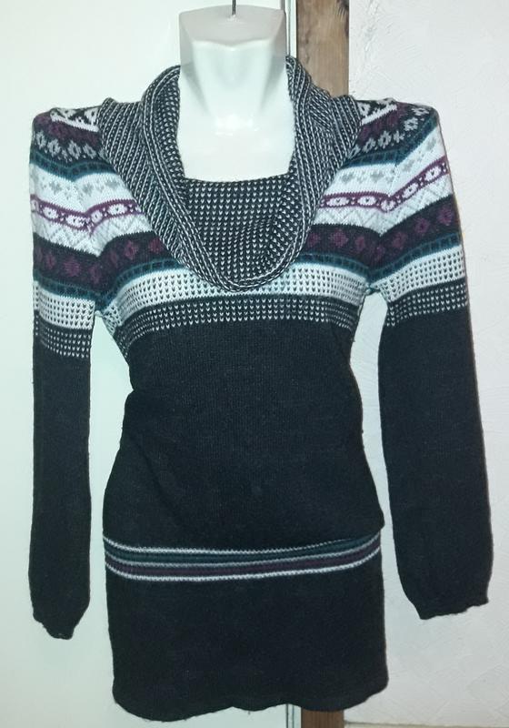 Тоненькая туника с хомутом Тепленькая.расцветка приятная Бу без явных следов носки На бедрах резинка не тугая .помогает выгодно скрыть недостатки😉 В комплекте вязаная сумочка ПОГ 42см ПОБ 46см Длина по спине 74 см Длина до резинке на бедрах 54 Рукав 59/42см Будет хороша на 46 48 размер
