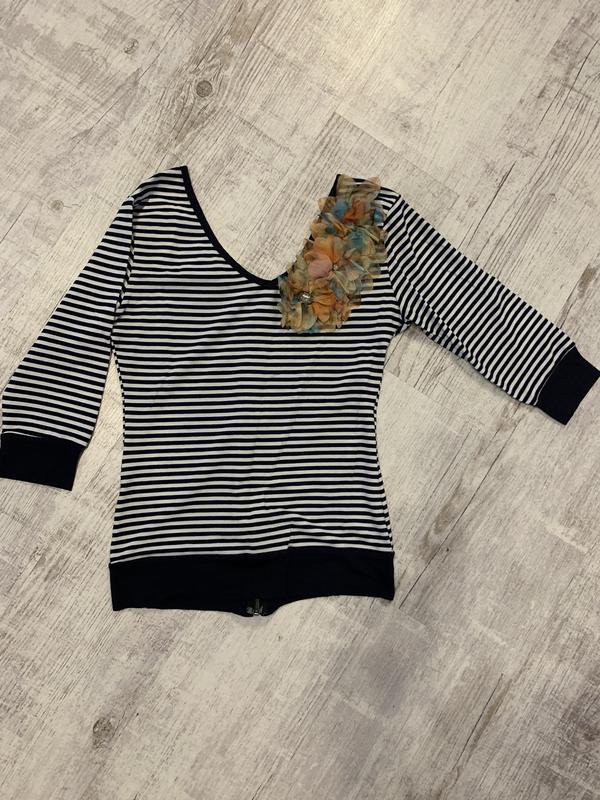 Темно-синий цвет в полоску впереди с отделкой и цветов из ткани. Сзади молния ( расстёгивается)