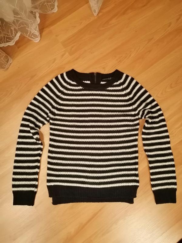 Симпатичный свитерок-тельняшка, на спинке замочек, по бокам разрезики, задняя полочка на 4 см длиннее переда. Спинка 64 см, замок 12 мм, плечи спущены, рукав от горловины 76 ми, подмышки 47 см, низ 45 см.