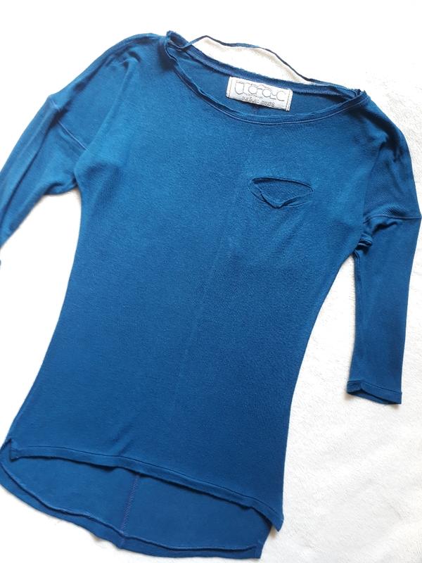 Тоненькая кофточка синего цвета, приятная на ощупь. Рукав четвертной. Удлиненная спинка.