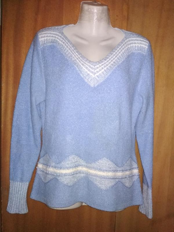 Джемпер женский ,голубого цвета нежный красиво оформлен с вкраплением белой ниточкой по горловине ,рукавчику и низу 1переда .По низу переда нашиты бусинки. Плечи -40,5 ПОГ -50 ПОБ -55 Рукав длина -66 Длина по пройме -27 Ширина по бицепсу -17 Ширина по низу -10