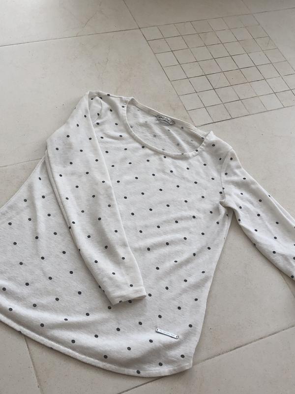 Базова біла кофта в чорний горошок. Приємна до тіла тканина, якісний матеріал. Стан ідеальний, дефектів та катишків немає. Ідеально доповнить образ в школу або на роботу.