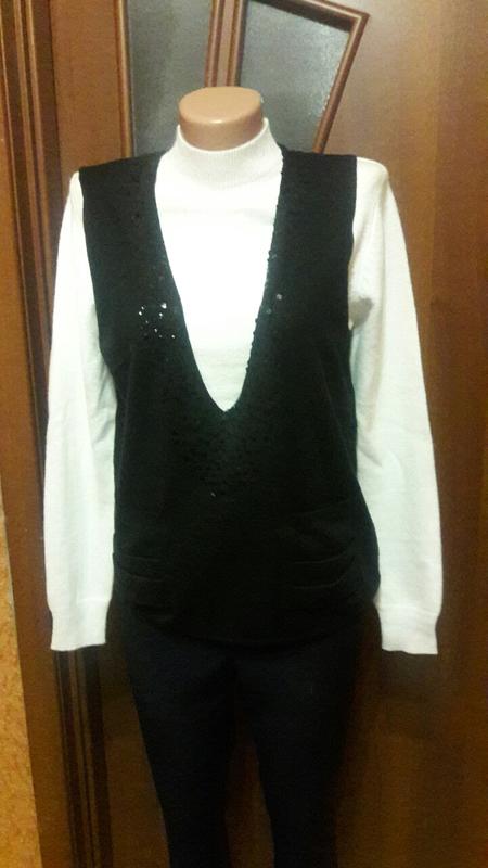 Очень красивый жилет черного цвета.Есть серый. Глубокий вырез, который зрительно вытягивает фигуру. Тонкий и теплый.
