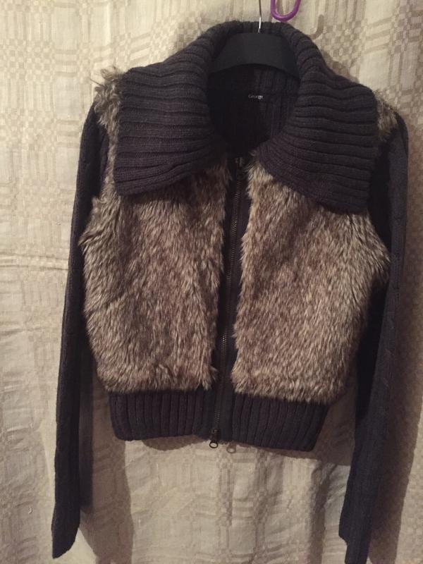 Серая,вязаная кофта с мехом впереди,на змейке,без карманов Дл.рук-70см,пог55см,пот-40см,дл.по спине-53см