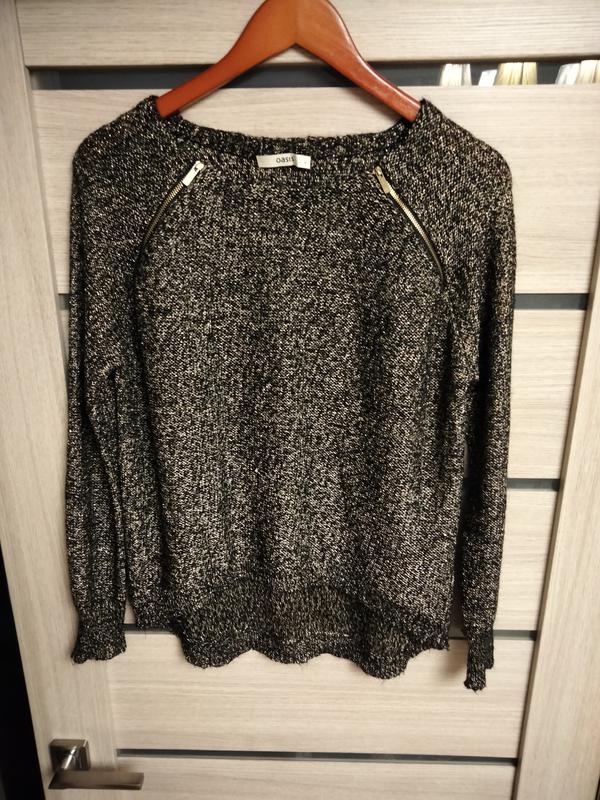 Оаѕіѕ кофточка дуже гарна камера не передає, вона з золотими замками і золотими нитками. Спереду трохи коротше довжина. Розмір М, але краще виміри уточнюйте. Склад: шерсть 31%, акрил 30%, поліестер 16%, полиэмид 15%. Пересилання, торг.