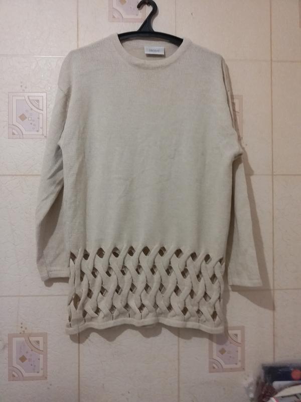 Оригинальный пуловер кофта бежевого цвета прямого силуэта с круглым вырезом, со спущеным плечом, у кромки низа узор переплетение 20см, Материал: трикотаж мягкий приятный 70%акрил,30%шерсть, тянется. Состояние идеальное , без дефектов. Замеры в нерастянутом виде: полуобхват груди 52 см и так до кромки низа, длина рукава от плеча 52, плечо 21см, ширина рукава в области подмышек 40см, длина до декоративной отделки 54см, до низа кромки 74см.
