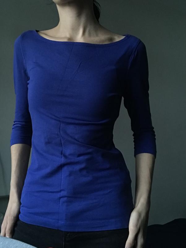 Базовий пуловер насиченого синього кольору від H&M. Розмір S. Рукав 3/4. Досить довгий, облягає фігуру, ідеально заправляти в юбку/брюки. Матеріал Котон+спандекс, тягнеться.