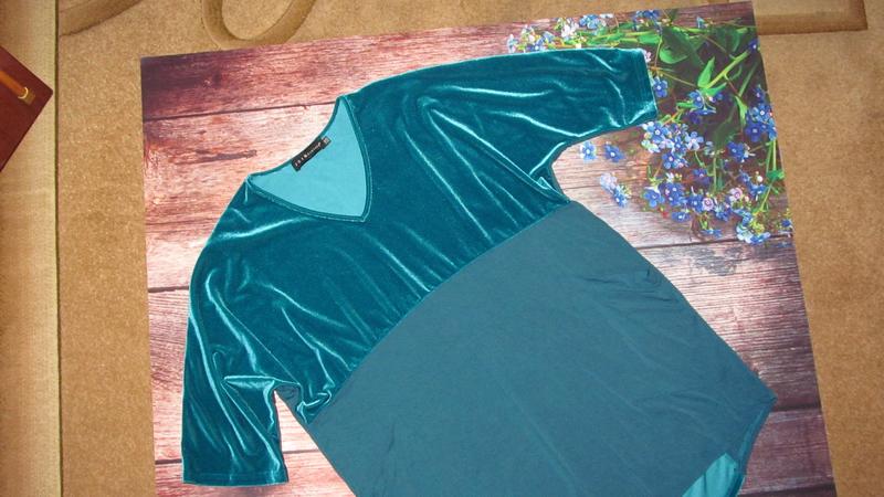 Очень красивый полувер-туника сочетание велюра и вискозы придают вещи нарядности Р 20/22 ПОГ-свободно (рукав летучей мышью) (70/75) ПОБ-52/70 рукав 3/4 Длина по центру спины-91 см перед-84 см Сост.новое, но без этикетки