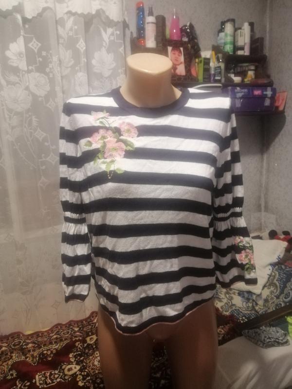 Красивый реглан в полоску с вышивкой на груди и рукаве.Рукава-снизу -фонариками на резинке.Покраяхрукавов и снизу розово-блестящая коемка.легкая и приятная к телу ткань . Состояние очень хорошее.Состав:53%вискоза;45%катон;1%полиамид;1%полиэстер.Размер указан 12(40) Замери:ПОГ-46,5см;ПОниза-46см; ПЛЕЧИ-37СМ;РУКАВ-45,5;ДЛИНА-52см.