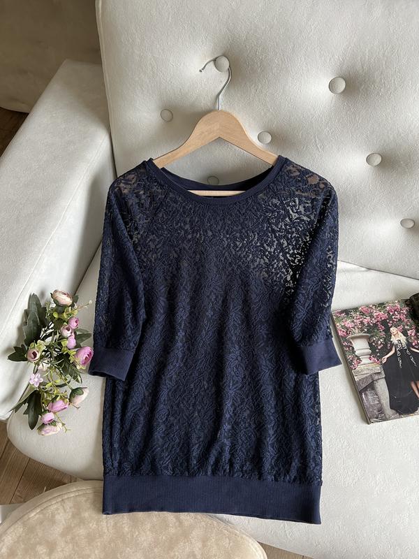 Кружевная кофта синего цвета бренда Atmosphere. Легкая и удобная, приятная к телу. Красиво сидит по фигуре. Размер по набору 34. Замеры: 1/2 ОГ 56-62 1/2 ОТ 46-54 Длина 70 Рукав от шеи 51