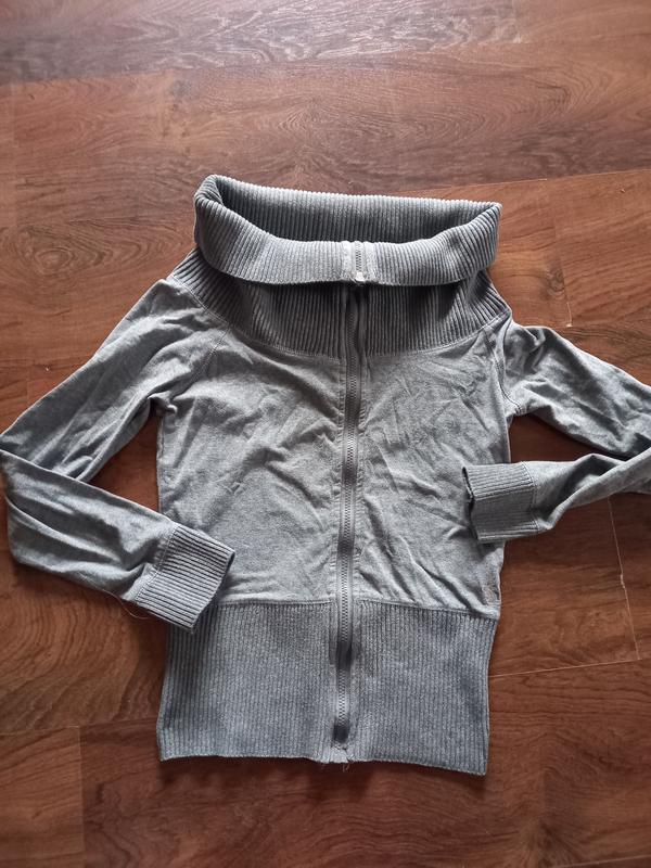 Кофта на молнии,воротник широкий резинка,видно плечи.Тонкий трикотаж.Состояние новой.Рукав длина от воротника 62,воротник 20,подворачиваеться.Ширина низа кофты 36,ширина в груди 44.