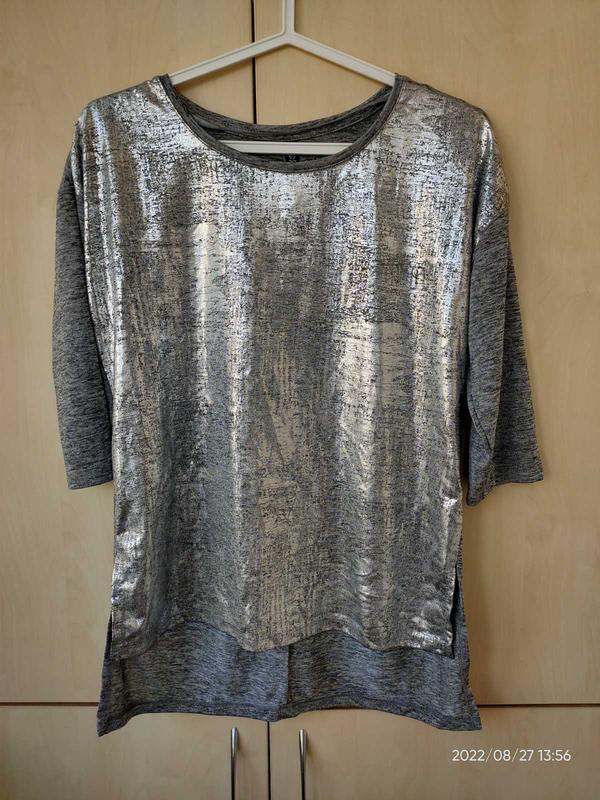 Реглан серебро размер S, замеры: полуобхват груди 47, полуобхват талии 46, полуобхват бедер 49, длина спереди 58, сзади 64, рукав 30. Спереди серебристое напыление. В хорошем состоянии, без дефектов.