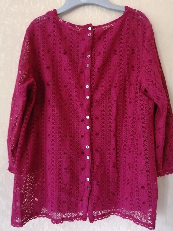 Хорошенькая и качественная натуральная ажурная кофточка. Подкладка - трикотажная майка на тонких бретелях (соединена с кофточкой) премиального британского бренда Fat Face. Изготовлена в Индии. Британский размер 12 европейский 40, американский 8. Совпадает по замерам с размером. В состоянии новой. Цвет малиновый (на фото выглядит красным). Состав: 57% хлопок, 39% модал (экологичная вискоза из эвкалипта), 4% эластан. Сзади маленькие перламутровые пуговицы. Кружевная кофта немножко тянется, майка тянется сильнее. Ориентируйтесь по кружевной. Длина от верха плеча 62 см ПОГ 52 см Рукав (три четверти) 45 см Ширина по плечах 41 см.