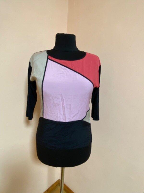 Классная кофточка из вискозного трикотажа и шифона, размер 34 указан, фасон оверсайз, демонстрировано на манекене 52 размера. Стан новой, может один раз одита была, сзади замочек до половины спинки.Длина - 61см, плечи - 50см, приспущенные идут, рукав от плеча - 36см, пог - 49см, пот - 46см, поб - 49см.