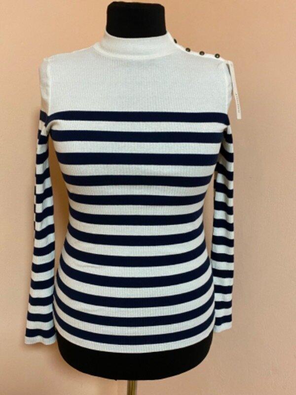 Классный гольф черно белого цвета, размер М указано. Длина - 63см, плечи - 37см, рукав - 64,5см, пог- 42см, к низу прямой. Хорошо тянется.Ярлика со составляющими нет, коттон и эластан.
