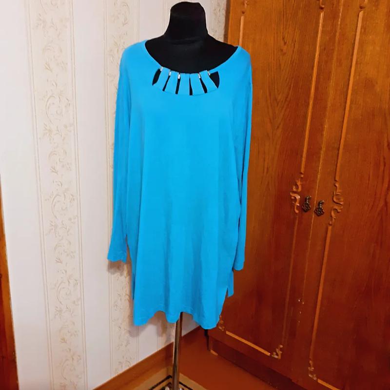 Удлиненный реглан горловина на вырезах с лювесами украшена в составе катон модал с боковыми разрезами👍Дл.82 Пл.48 Р 60 Б по 19+Ог 130-140 Об 140 +б/р в.14см!сост.н/в!