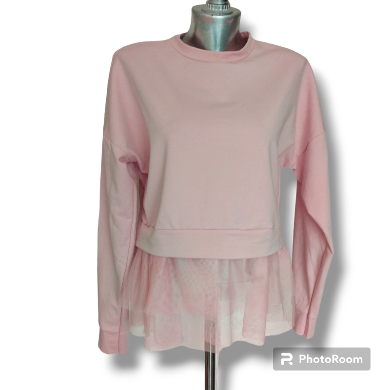 Фірмовий жіночий топ с декором у вигляді фатину. Склад 95% бавовна . Тканина трикотаж двохнитка. Колір світло -рожевий. Країна виробник Італія. Бренд I saw it first. Розмір вказаний S, оверсайз . Підійде і на М. Довжина 62, Напівобхват грудей 53 см, Довжина рукава до коміру 74 см. Стан нового.