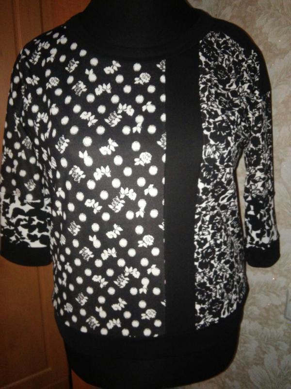 длина 64см рукав 38см(хорошо за локоть)ПОГ 60см++ ПОБ 61см Ткань мягенькая тянется приятная средней плотности не мнется Вещь без постороннего запаха и готова к ношению Сочетание разных принтов черно-белых.В общем все в меру-ненавязчиво-с шиком Вещь универсальная-и в мир и на пир Манекен 56-58 размера-как раз