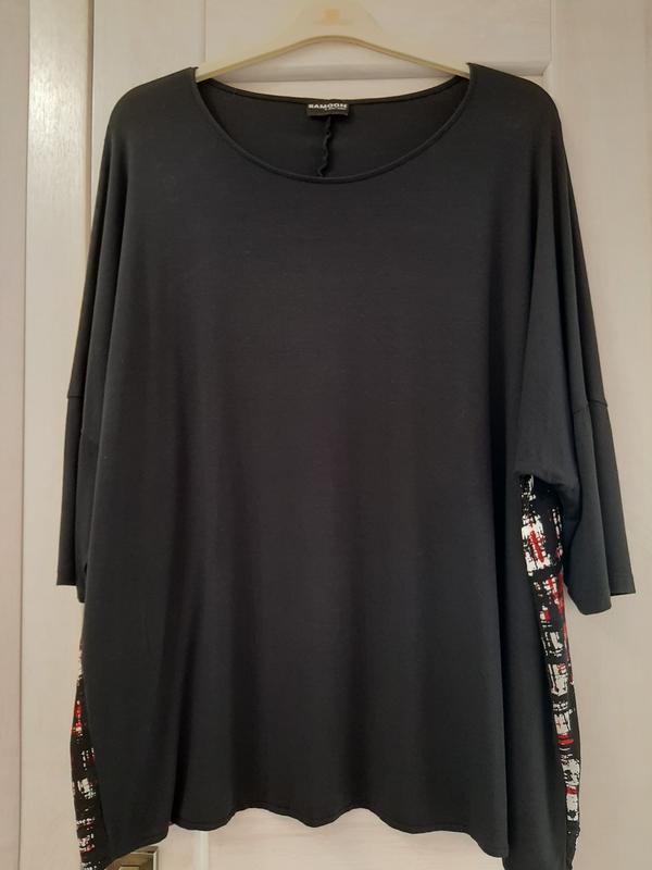 Длина - 76 см, пог- 75 см, поб - 75 см. Спереди - футболочный трикотаж, сзади - штапель. Кофта легкая, неощутимая на теле.