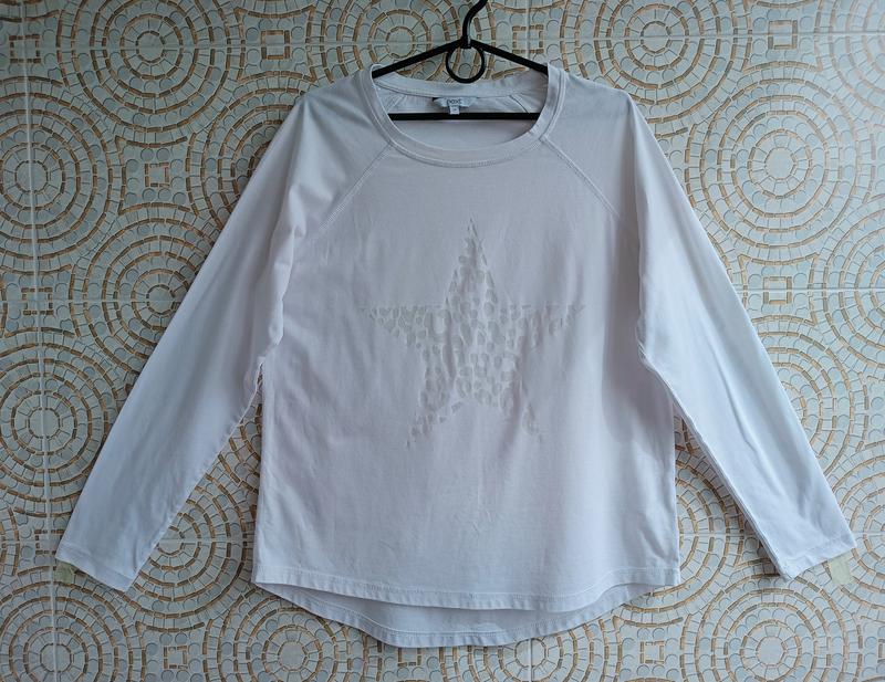 Реглан женский белого цвета, бренд Next. Производство Турция. Ткань по плотности, как футболочная, спереди рисунок, просвечивающийся, в виде звезды (для демонстрации на фото подкладывала цветную бумагу). Низ закутий, спинка занижена. Склад - 50% котон; 50% полиэстер. Размер 14/42 (на 50) Замеры (см): длина-перед/спинка 64/70; полуобхват груди 53; длина рукава от горловины 72. Нарядная фирменная кофточка. Состояние очень хорошее.