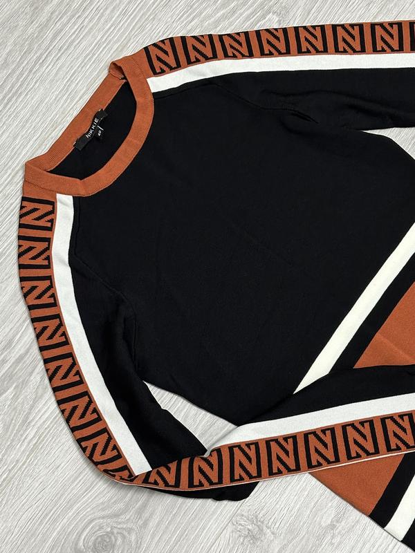 Реглан NIKKIE - это классический топ с изюмом. Микс черного, белого и коричневого цветов с логотипом N. По фигуре прилегает плотно. Стан нового. Не был в использовании. Цена на сайте 119$. ПОГ 40 Рукав от горловины 76 см Длина 61 Замеры в не растянутом состоянии. Кофтинка тягнеться. 67% вискоза, 33% полиамид.