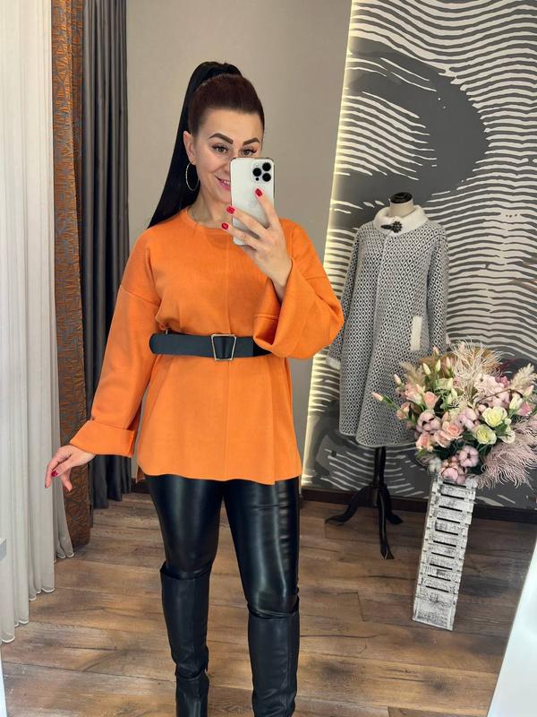 шикарный свитер прямого кроя с круглым вырезом и поясом в комплекте с первой минуты попадает в наши сердца и гардеробов, всеми любимый свободный крой, изящный декоративный шов спереди визуально делает фигуру стройнее, аккуратный круглый вырез на груди, длинные рукава свободного кроя, высокое качество трикотажа машинной вязки в удивительно красивых осенних оттенках, не оставит равнодушной ни одну ценительницу красивой одежды размер оверсайз 48-52 длина 70/74 спинка чуть длиннее передней части, объем груди по изделию 118 см, длина рукава от шеи 71 см код 0624