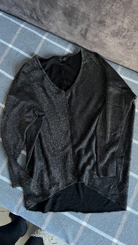 Очень красивая кофточка, сияющая с люрексом.На размер xl, но подойдёт и на меньшую, мягкую, очень хорошо тянется.Рука приспущенные, с переди немного короче.Майже новая.