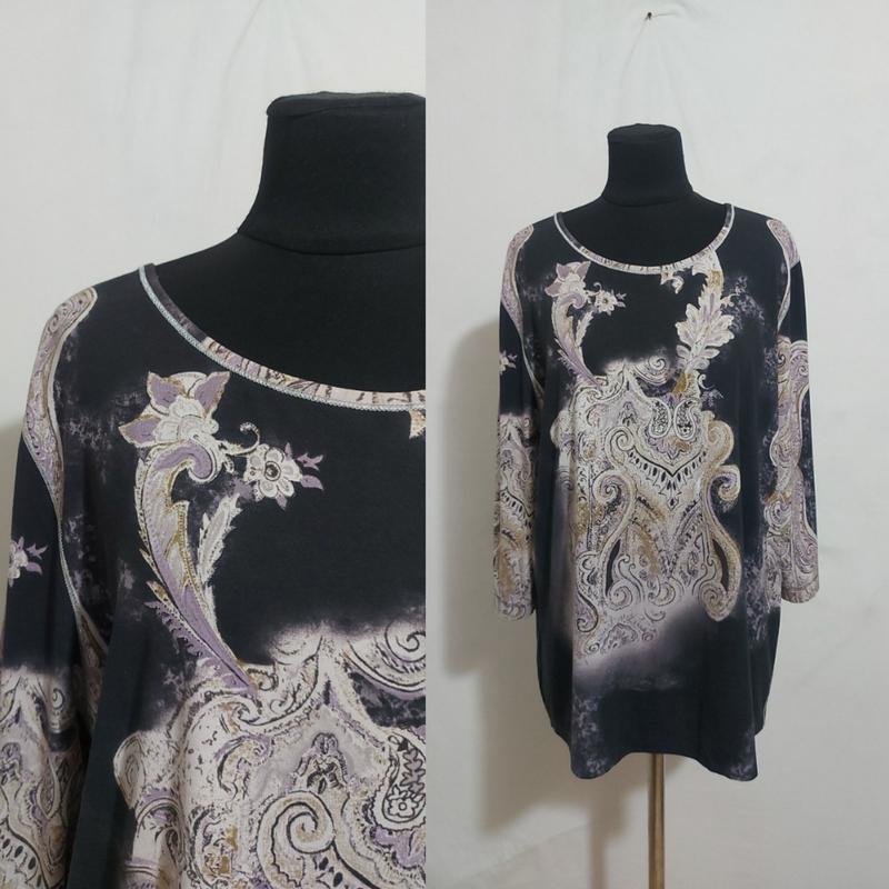 Отличное состояние Хорошо тянется Приятный к телу Красивая абстракция, узоры Отлично держит форму В составе 92%-вискоза за, 8%-эластан Указан размер 48 ПОГ-62 плечи-48 рукав-43 ширина по нижн краю-62 длина изделия от плеча-68