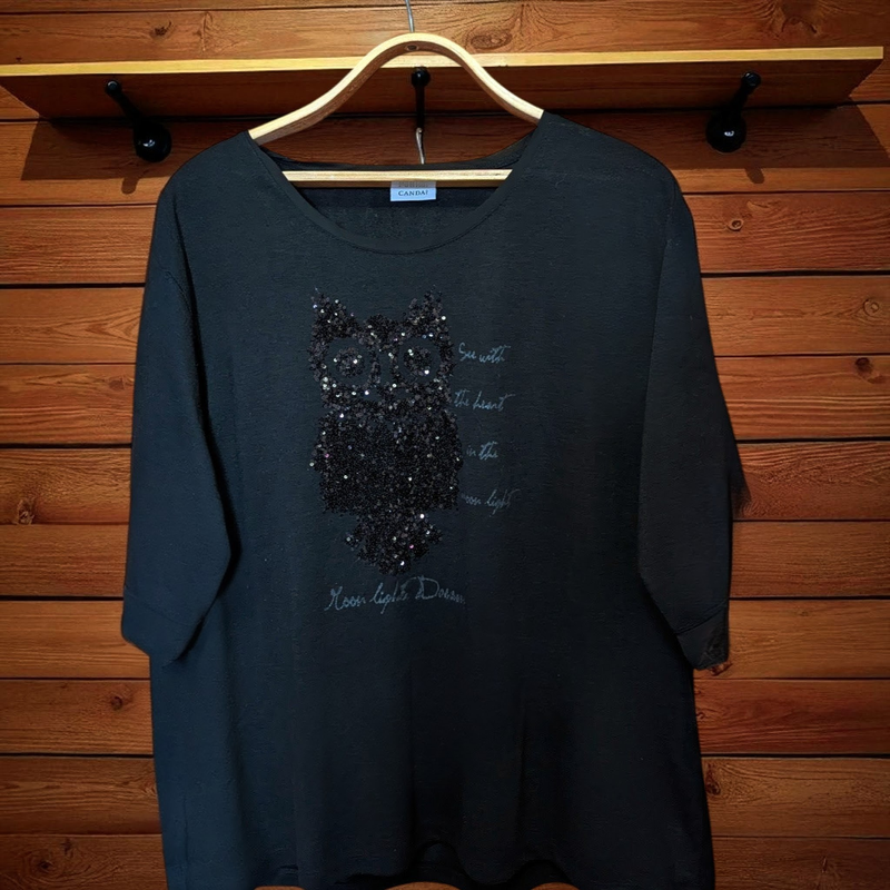 Натуральная ткань, совушка из паеток,надписи рядом с ней, серебряного цвета, которой красиво мерцает 👍 красиво тянется, приятная к телу ❤️ длина 74см.ог.полов. 70/75см.стегна полу 75/80см.👌