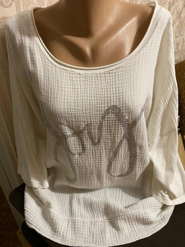 Блесенькая кофточка с аппликацией в камушки Замеры Рукав от горловины - 49 см / 21 см Груди - 72 см Длина - 67 см перед / 75 см зад Спереди ткань в виде жатки, спинки и рукава как футболочная ткань Размер идет от 50+